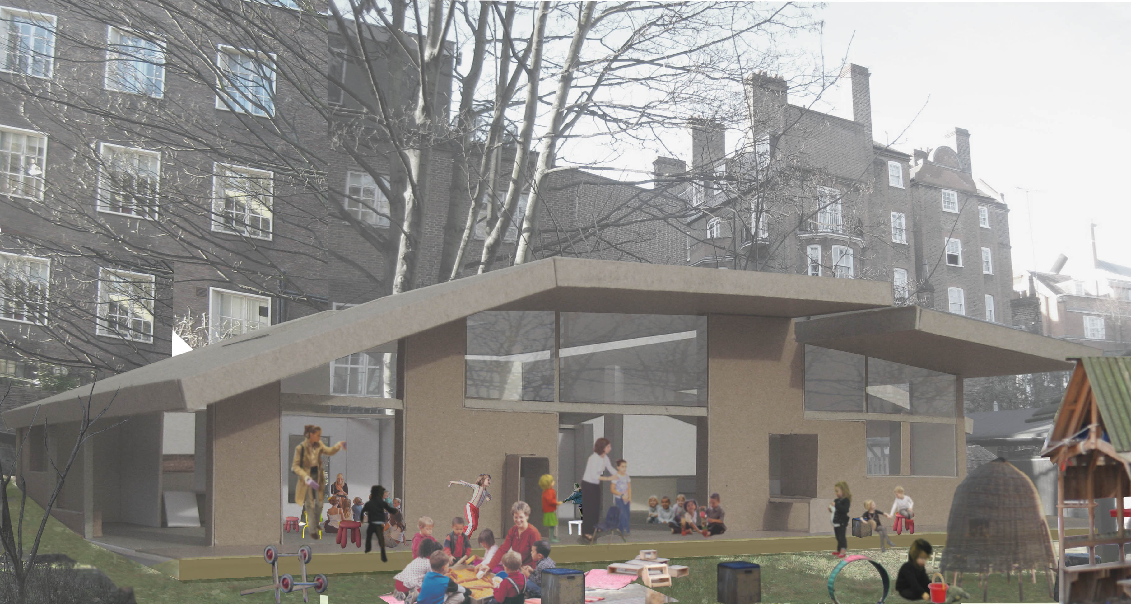We proposed a wooden structure nestling under the trees, weaving into the fabric of this garden, it’s neighbouring city buildings, the garden gate entrance and the tree positions. The nursery rooms reside beneath a large roof, which inflects upwards to a highpoint in the centre of the garden, and gently folds down to be equivalent to the height of the existing garden wall perimeters. This allows the garden walls to maintain their enclosing presence whilst offering variations of scale to the interior spaces, with obvious, yet playful relations between the scale of the child and the adult world.